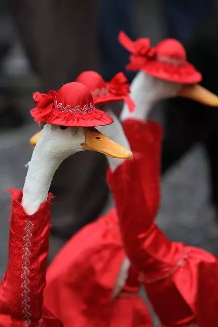 在澳大利亚每年的“悉尼皇家复活节农展会”活动中,夺人眼球的时装鸭子秀名为“PiedPiperDuckShow”,是一名60多岁名叫BrianHarrington的达人亲手为他农场的鸭子设计裁缝定制做的时装。真的比鸡好看多了!